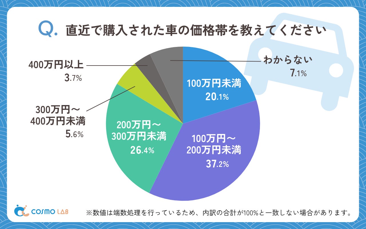 「100万円〜200万円未満」が37.2%で最も多く、「200万円〜300万円未満」(26.4%)、「100万円未満」(20.1%)と続き、200万円未満での購入が57.3%を占めます。「わからない」(7.1%)も一定数存在し、価格への意識が低い層や家族主導の購入も想定されます。