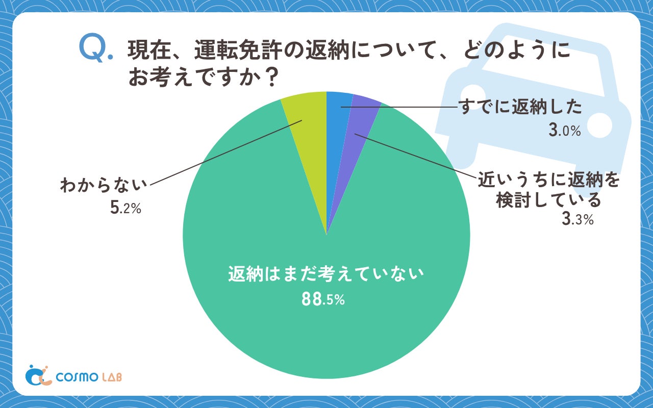 「返納はまだ考えていない」(88.5%)の回答が圧倒的に多く、「わからない」(5.2%)、「近いうちに返納を検討している」(3.3%)、「すでに返納した」(3.0%)が続きます。運転免許の保持意向が高く、移動の自由と利便性を重視していることが窺えます。返納を促すには、代替移動手段の提示や心理的負担の軽減が課題といえます。