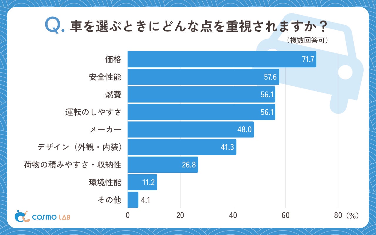 「価格」(71.7%)が最も多く、「安全性能」(57.6%)、「燃費」「運転のしやすさ」(各56.1%)が続きます。ブランドやデザインよりもコストと安全・利便性を重視する傾向が明確であり、高齢者特有のリスクを軽減する機能のニーズが背景にあると考えられます。