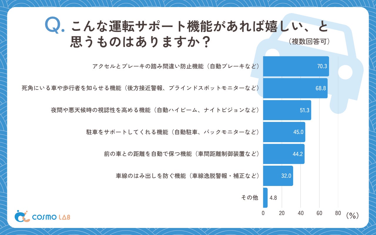 運転サポート機能として、「アクセルとブレーキの踏み間違い防止機能(自動ブレーキなど)」を70.3%の方が希望しています。安全運転への不安を技術で補いたいというニーズが明確に表れています。