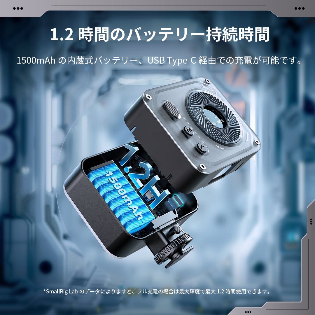 P96 ProとP108 Proには1500mAhのバッテリーが内蔵されており、最大出力で使用しても約1.2時間の長時間撮影が可能です。USB-Cポートを備えており、充電しながらライトを使用することもできます。