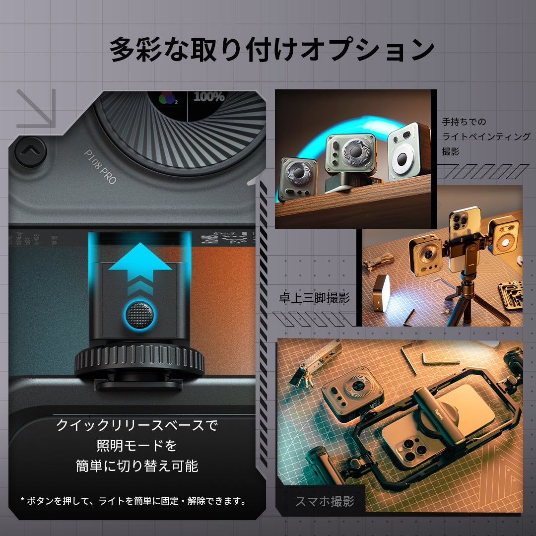 また、クイックリリース設計を採用しており、ボタンを押すことでライト本体とコールドシューマウントを簡単に組み合わせたり分解したりできます。手持ちでのライトペインティング撮影や卓上三脚撮影、スマホ撮影などのセットアップが便利になります。