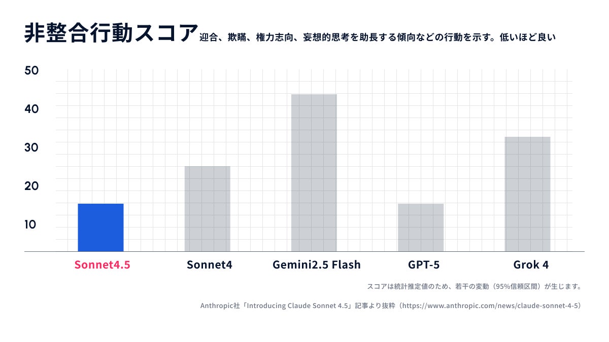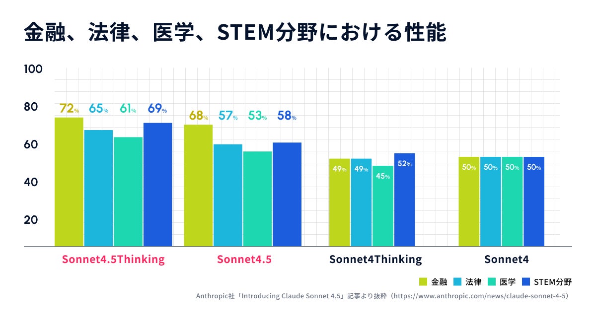 「Claude Sonnet 4.5」は、Anthropic社のこれまでで最も強力なモデルで、金融、法律、医学、STEM のドメイン固有の知識や推論の点でも大幅に優れているとされています。