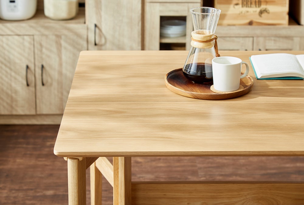 天板には美しい木目が特長のオーク材を使用し、ダイニング空間に温かみをプラスします。天板表面にはウレタン塗装を施しているため、耐水性と耐久性を強化。日常のお手入れも簡単にできます。