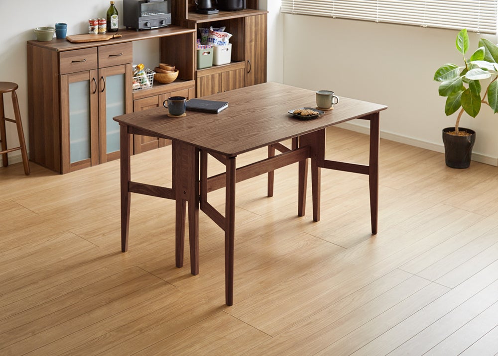 今回新発売する「拡張式ダイニングテーブル」は折りたためるダイニングテーブルで、使用シーンに合わせて多用途に使えるのが魅力です。