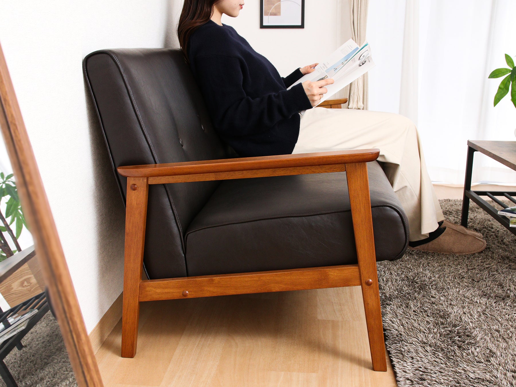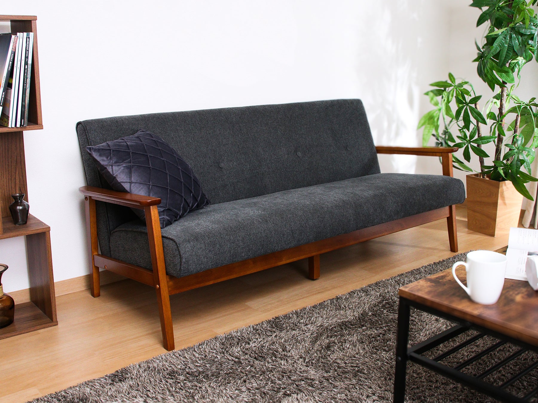 ソファミートは大人の雰囲気を漂わせながらも、ラフで飾りすぎないかっこよさが魅力です。ダーク色でスマートな印象を与えつつ、木フレームで温かみを演出します。相性のいいインダストリアルな家具や小物と合わせるとお部屋の印象もアップ。ノスタルジックな空間をつくり出します。