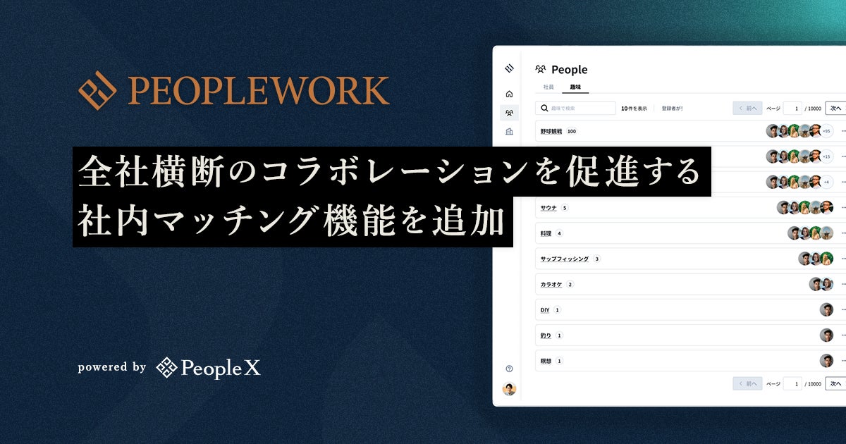 エンプロイーサクセス事業を推進する株式会社PeopleX(本社:東京都渋谷区、 代表取締役 CEO:橘 大地、以下:当社)は、エンプロイーサクセスHRプラットフォーム「PeopleWork」に、全社横断のコラボレーションを促進する社内マッチング機能を追加したことをお知らせいたします。
