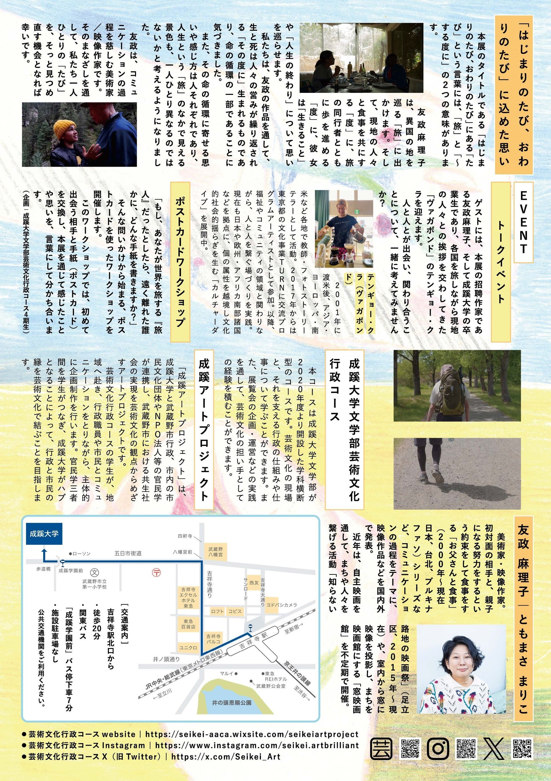 ゲストには、本展の招聘作家である友政麻理子、そして成蹊大学の卒業生であり、各国を旅しながら現地の人々との挨拶を交わしてきた「ヴァガボンド」のテンギョー・クラを迎えます。人と人とが出会い、関わり合うことについて、一緒に考えてみませんか?