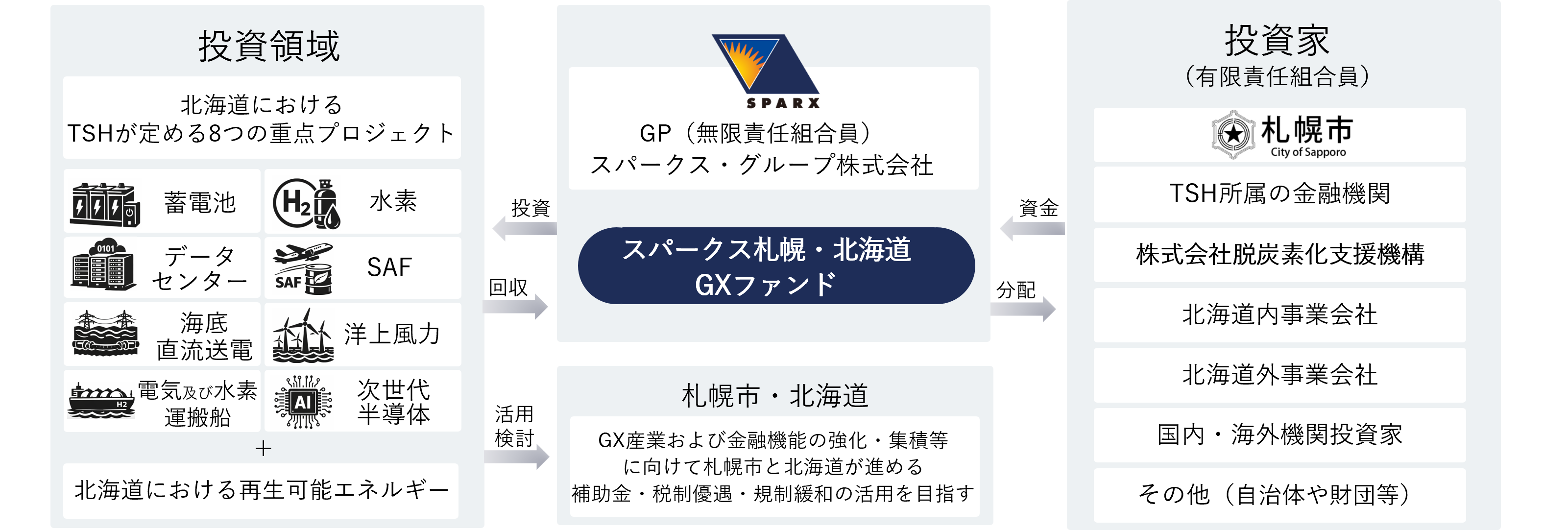 投資対象:主に、以下に掲げるTSHの8つの重点領域および再生可能エネルギーに関する北海道内の稼働前のGXプロジェクト