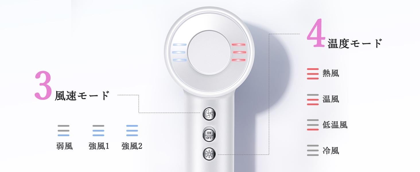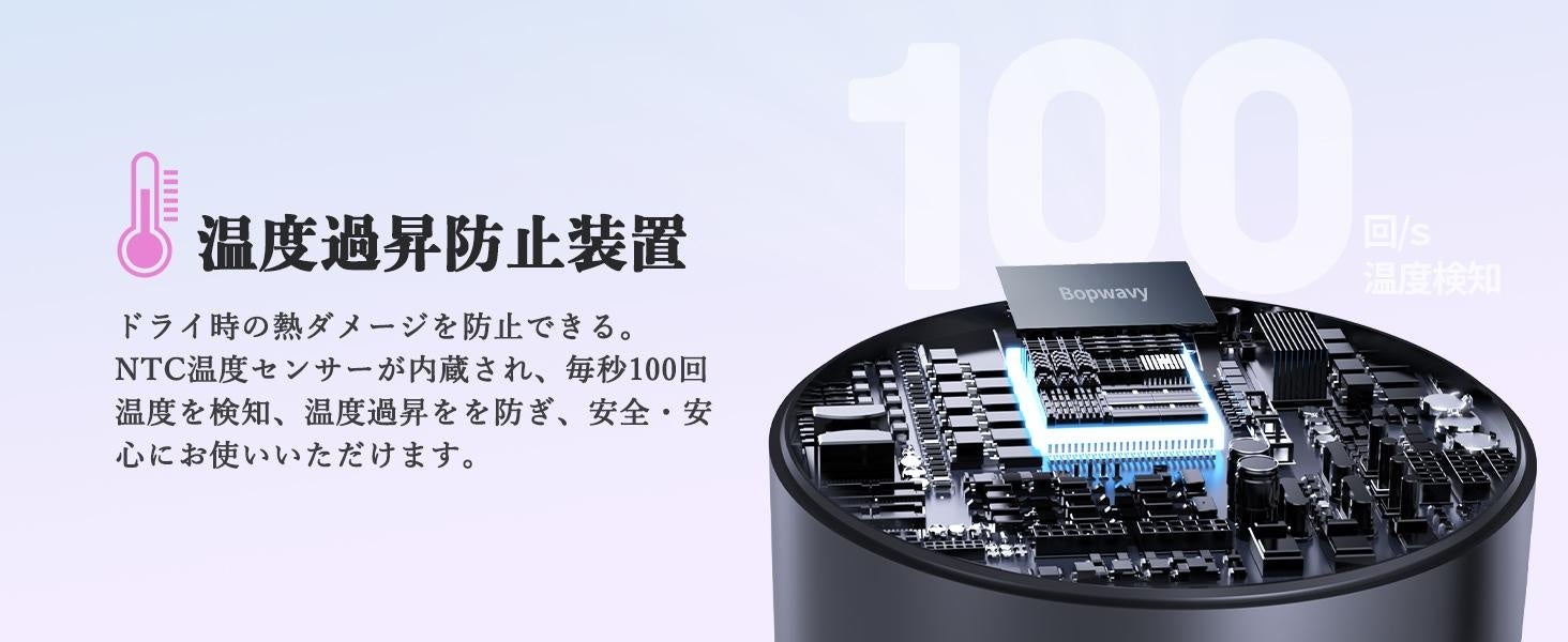100回/秒温度検知&温度過昇防止 :Bopwavyドライヤーは4段階風温+3段階風速でお好みに合わせて自由に12モードで調整できます。NTC温度センサーが内蔵され、毎秒100回温度を検知、温度過昇をを防ぎ、安全・安心にお使いいただけます。また、メモリー機能も搭載、前回使用のモード・風量を記憶して、毎回の設定は不要で便利です。