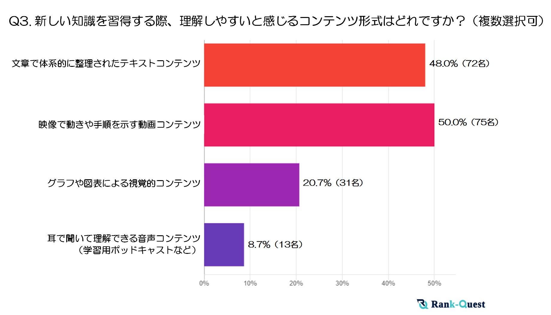 調査結果➂:新しい知識を習得する際、理解しやすいと感じるコンテンツ形式はどれですか?(複数選択可[注])