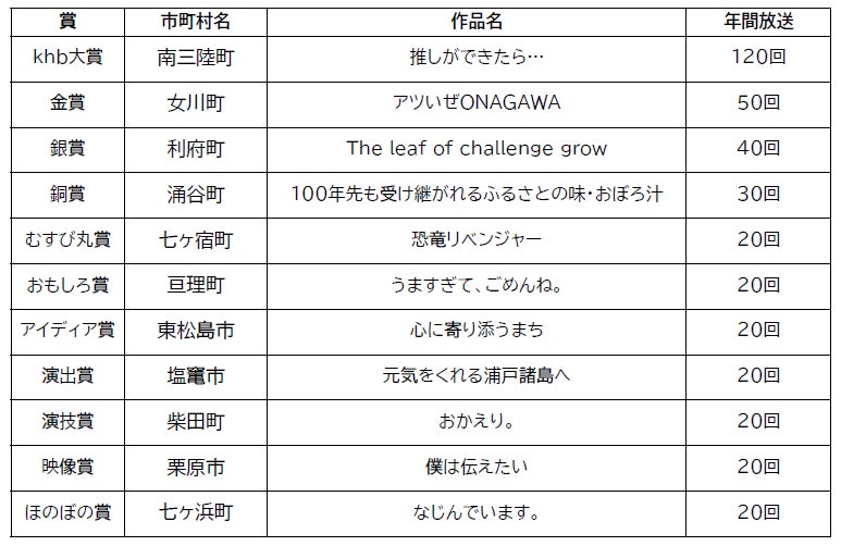 株式会社東日本放送(本社・仙台市太白区)は、11月23日(土)にkhbぐりりホールで 第23回khbみやぎふるさとCM大賞発表審査会を開催しました。厳正な審査の結果、南三陸町の作品「推しができたら…」がkhb大賞を受賞し、khbで年間120回放送されます。南三陸町は2022年以来2回目のkhb大賞受賞となります。このほか各賞が選ばれ、khbではそれぞれの賞に応じた回数を放送します。