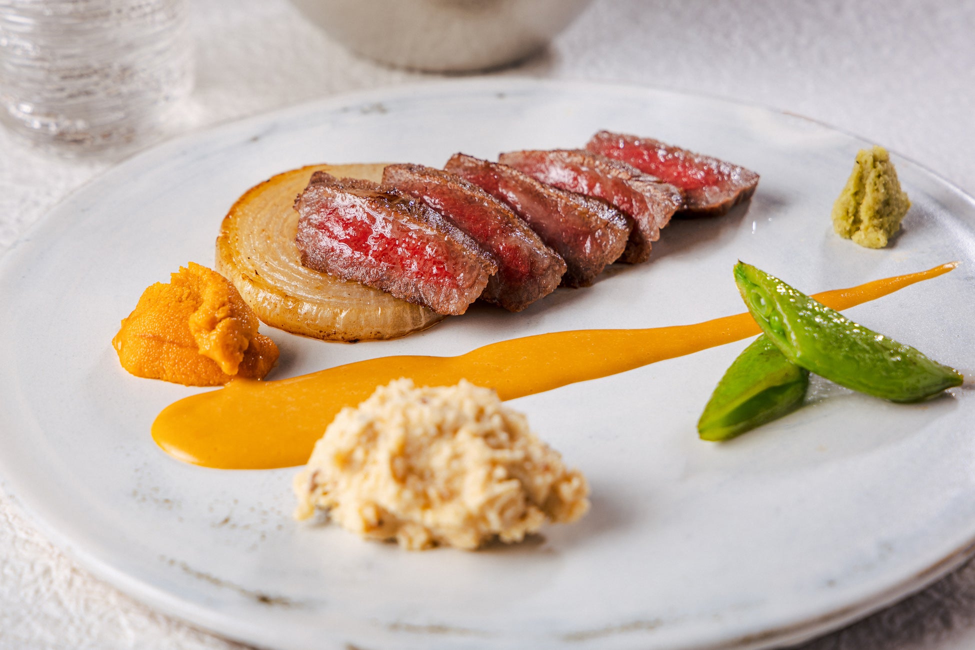 シンプルに焼き上げた尾崎牛のステーキを、雲丹と『銀座豉特選 禅 甘口白糀』で仕上げたソースとともにお召し上がりください。