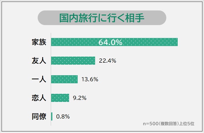 国内旅行に行く相手は、「家族」が全体の6割以上を占めました。「夫婦二人」や「配偶者と子ども」など、結婚後の家族との旅行が多かったものの、「実家の家族(母親や姉妹)」という人も少なくありませんでした。