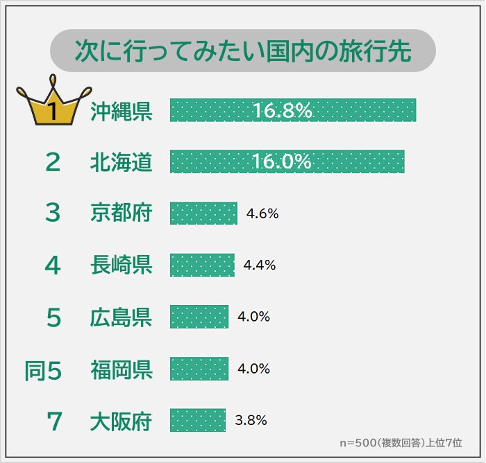 全国の男女500人に「次に行ってみたい国内の旅行先」を聞いたところ、1位は沖縄県(16.8%)」、僅差の2位は「北海道(16.0%)」でした。
