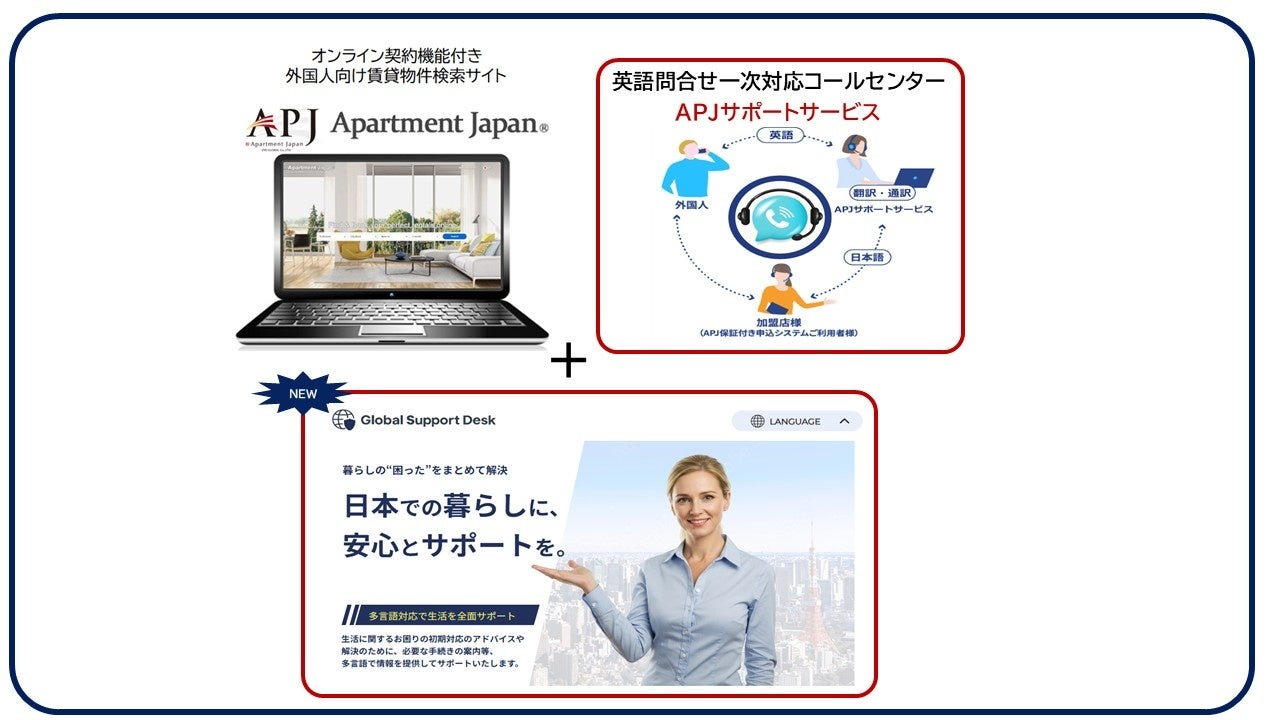 Renxa株式会社(読み方:レンサ、東京都豊島区 代表取締役:坂本幸司、以下「当社」)は、業務提携先であるDID-GLOBAL株式会社(本社:大阪市中央区、代表取締役:近藤暁子、以下「DID-GLOBAL」)が運営する外国人専用賃貸DXプラットフォーム「Apartment Japan®(以下「APJ」)」において、当社の多言語生活サポートサービス「Global Support Desk(グローバルサポートデスク、以下「本サービス」)」の提供を新たに開始いたします。