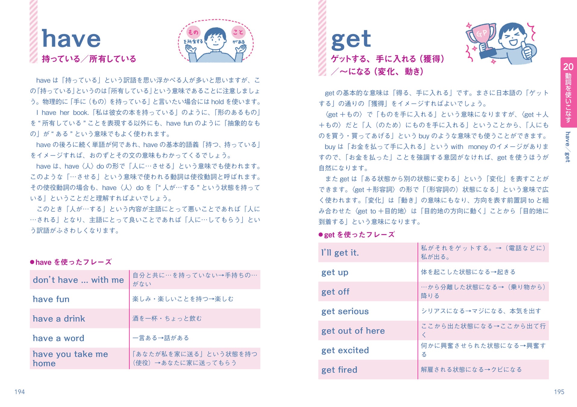 各パターンの例文では、have、get、makeなどよく使われる基本の20動詞のみを使っています。また、後半ではそれぞれの動詞についてまとめて解説しています。