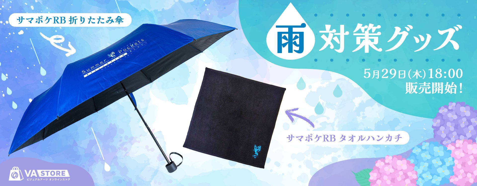 また、雨の日対策グッズとして「Summer Pockets RB ロゴ入り折り畳み傘 」が新規で登場!合わせて「Summer Pockets RB モチーフタオルハンカチ(サマポケver)」の再販も決定!