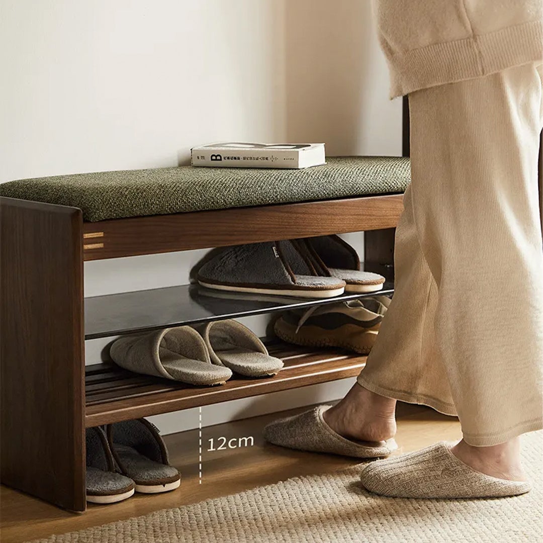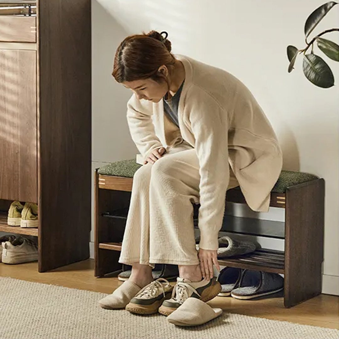 高級感あふれるウォールナット材を使用したシューズベンチ。座面の高さ46cmで靴の脱ぎ履きがしやすく、3段収納で玄関まわりをスッキリ整理整頓。通気性に優れた格子デザインが湿気を逃がし、匂いがこもりにくくいつでも清潔に。
