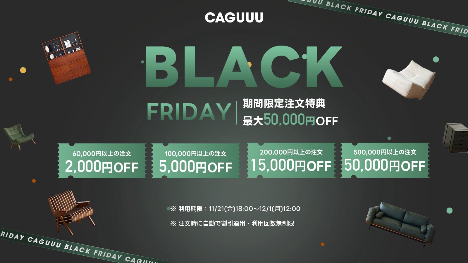 この度、CAGUUU株式会社(本社:東京都港区、代表取締役社長:中村勇輝)は、おしゃれで高品質な家具をリーズナブルな価格で展開する「CAGUUU」(呼称:カグー)にて、2025年11月21日(金)18時から12月1日(月)12時まで「BLACK FRIDAY SALE」を開催いたします。