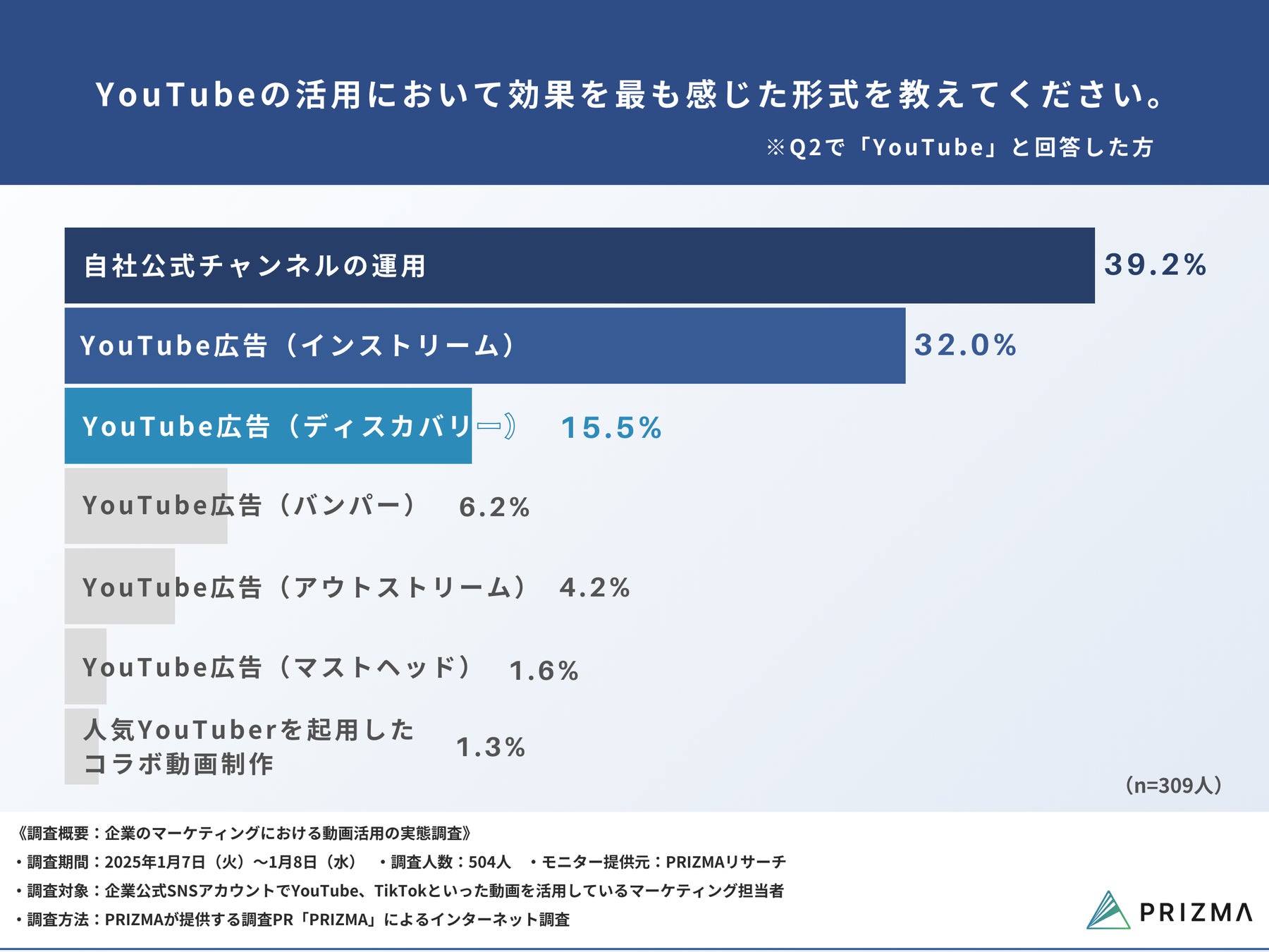さらに、「Q5. YouTubeの活用において効果を最も感じた形式を教えてください」と質問したところ、『自社公式チャンネルの運用(39.2%)』が最も多く、『YouTube広告(インストリーム)(32.0%)』、『YouTube広告(ディスカバリー)(15.5%)』と続きました。