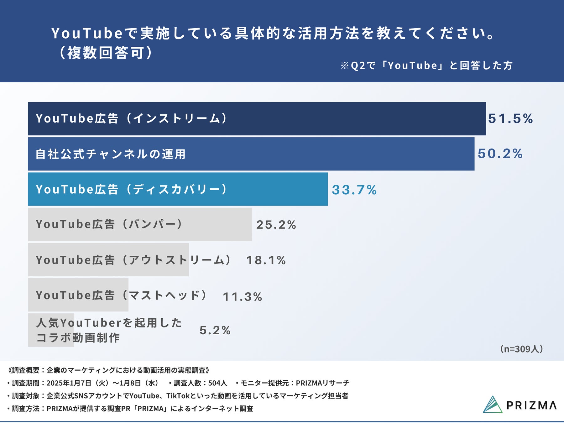 「Q4. YouTubeで実施している具体的な活用方法を教えてください」と質問したところ、『YouTube広告(インストリーム)(51.5%)』が最も多く、『自社公式チャンネルの運用(50.2%)』、『YouTube広告(ディスカバリー)(33.7%)』と続きました。