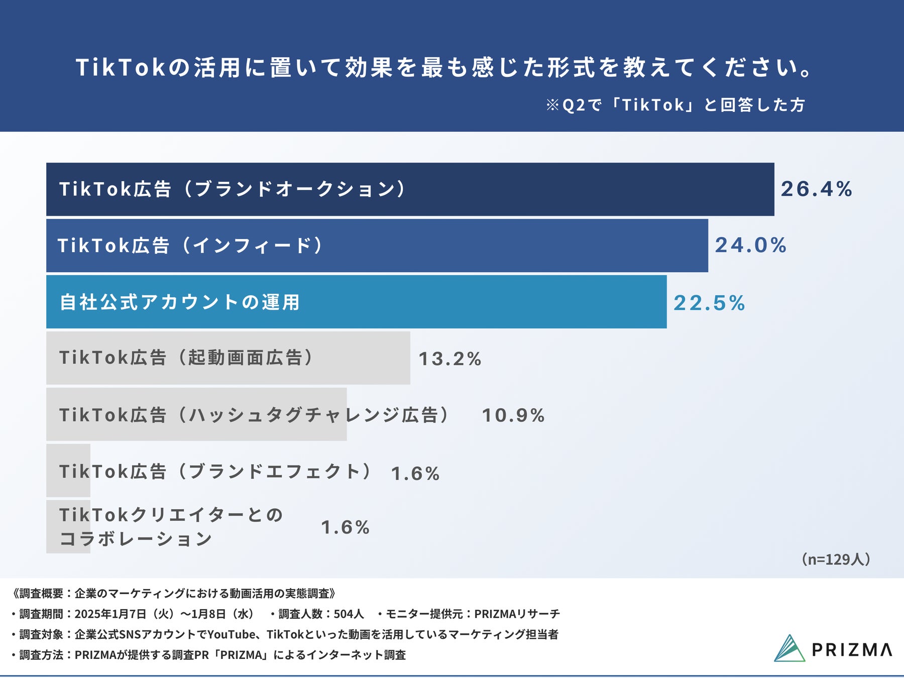 さらに、「Q8. TikTokの活用において効果を最も感じた形式を教えてください」と質問したところ、『TikTok広告(ブランドオークション)(26.4%)』が最も多く、『TikTok広告(インフィード)(24.0%)』、『自社公式アカウントの運用(22.5%)』が続きました。