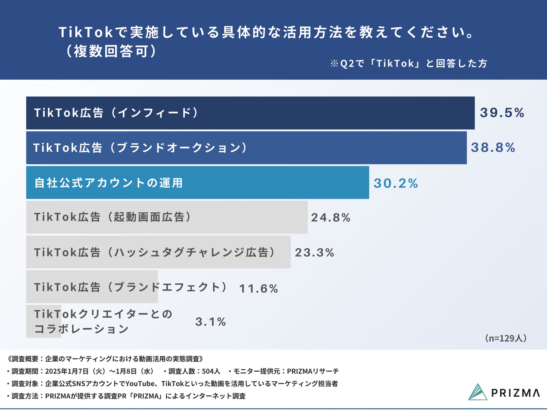 「Q7. TikTokで実施している具体的な活用方法を教えてください」と質問したところ、『TikTok広告(インフィード)(39.5%)』が最も多く、『TikTok広告(ブランドオークション)(38.8%)』、『自社公式アカウントの運用(30.2%)』と続きました。