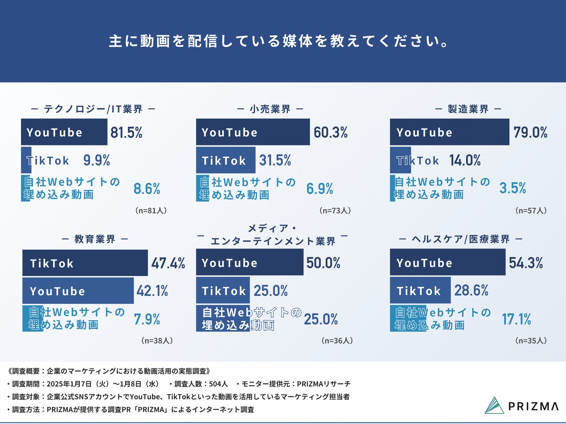 主に動画配信している媒体は、YouTubeが約6割・TikTokが約2.5割。業界別では差異も見られる