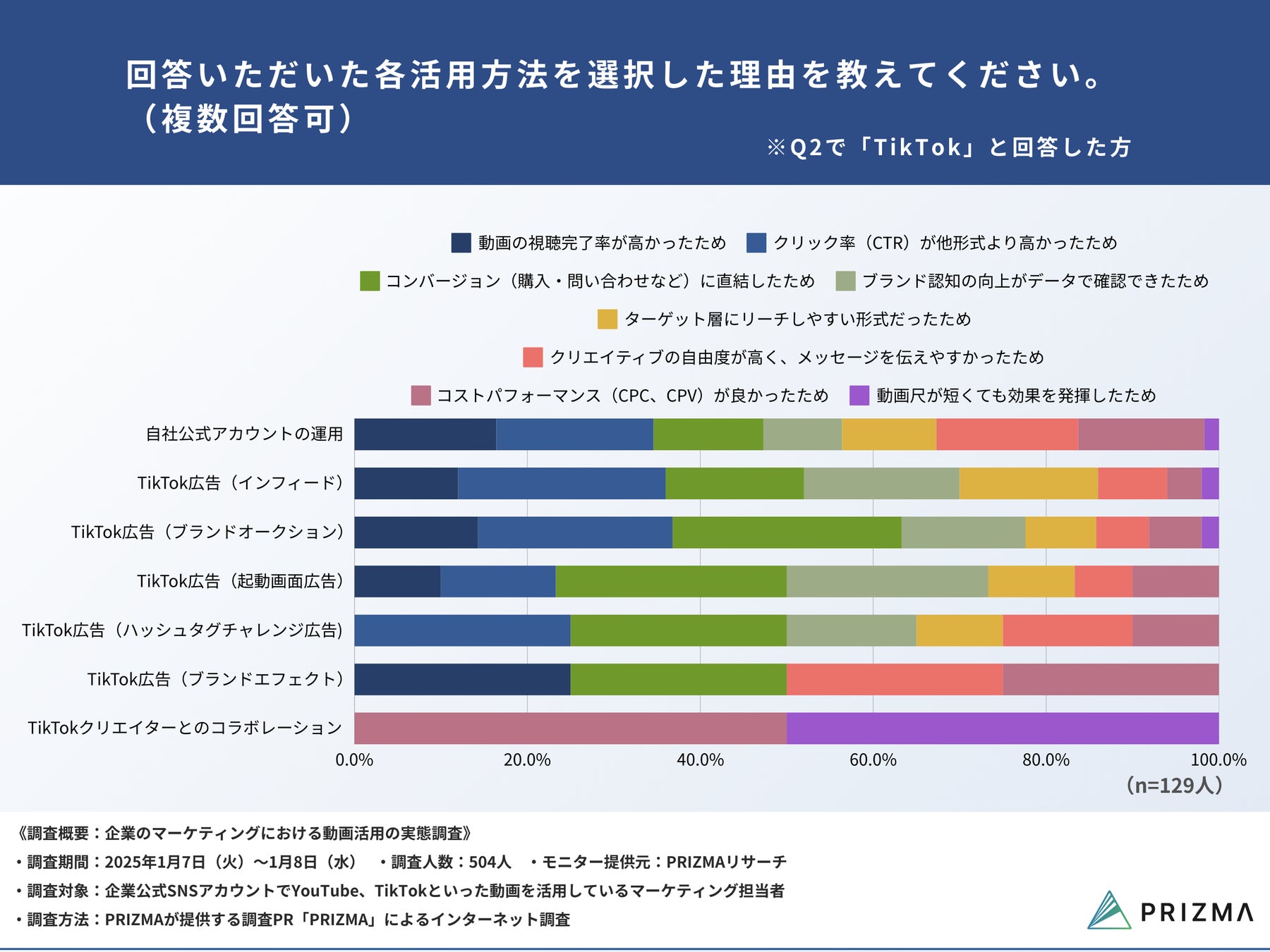 TikTok広告(ブランドエフェクト)では、『視聴完了率(25.0%)』『コンバージョン直結(25.0%)』『クリエイティブの自由度の高さ(25.0%)』が同等に評価されました。