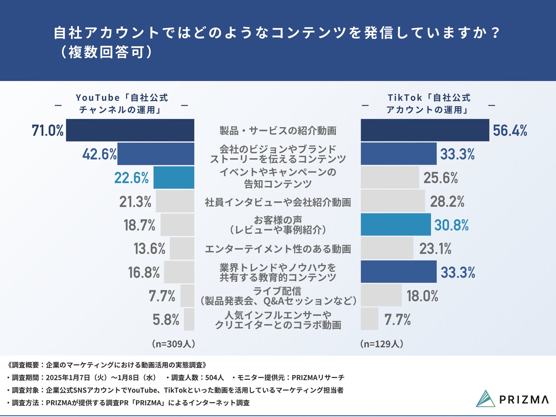 TikTokにおける「自社公式アカウントの運用」では、『製品・サービスの紹介動画(56.4%)』が最も多く、『会社のビジョンやブランドストーリーを伝えるコンテンツ(33.3%)』、『業界トレンドやノウハウを共有する教育的コンテンツ(33.3%)』『お客様の声(レビューや事例紹介)(30.8%)』が上位に挙げられました。