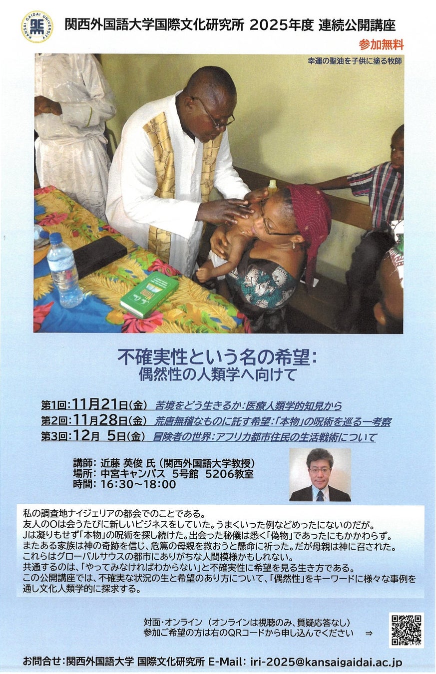 関西外国語大学(大阪府枚方市)の国際文化研究所(IRI)は、11月21日、28日、12月5日、中宮キャンパス5号館5206教室で、近藤英俊・外国語学部教授(文化人類学)による連続公開講座を開きます。