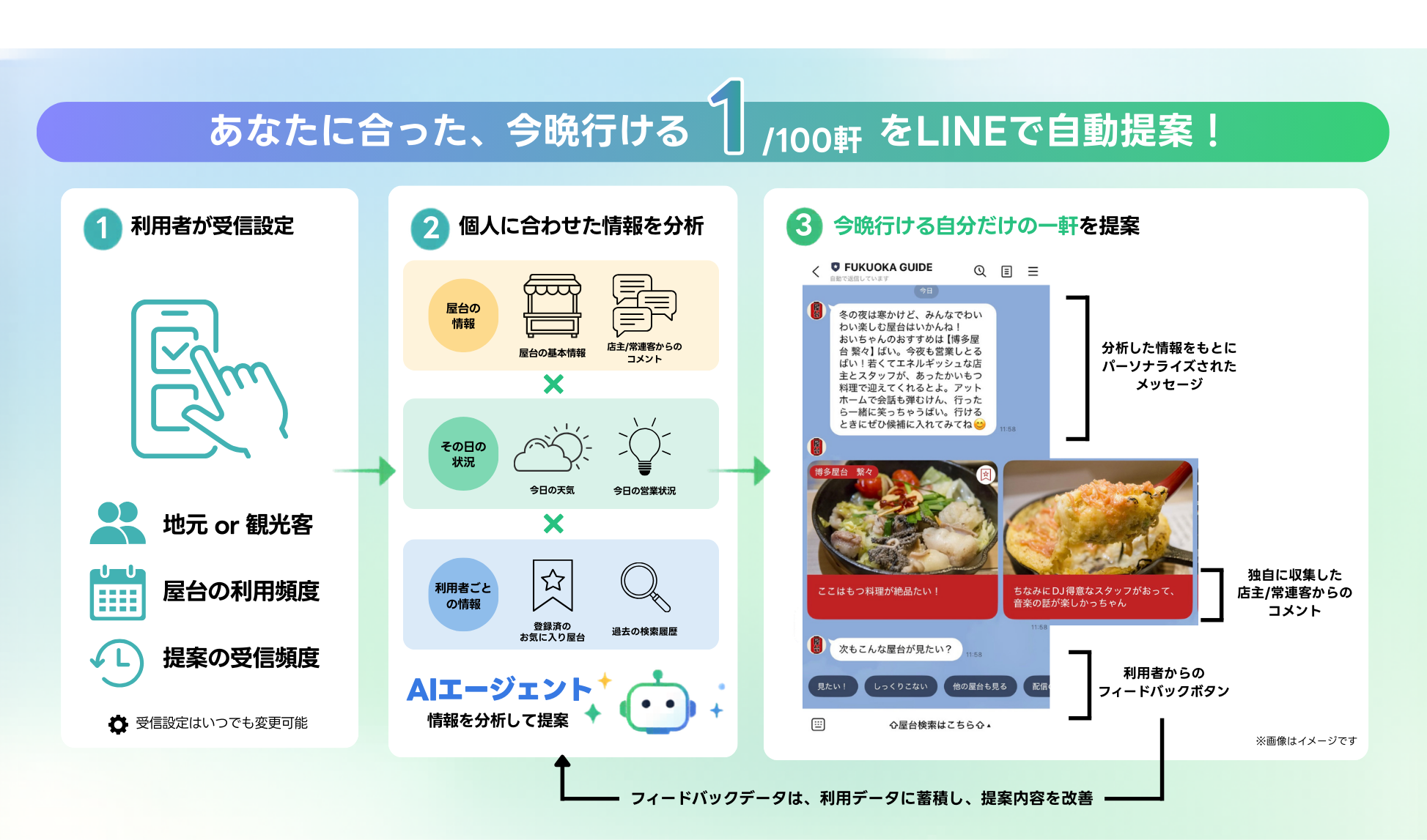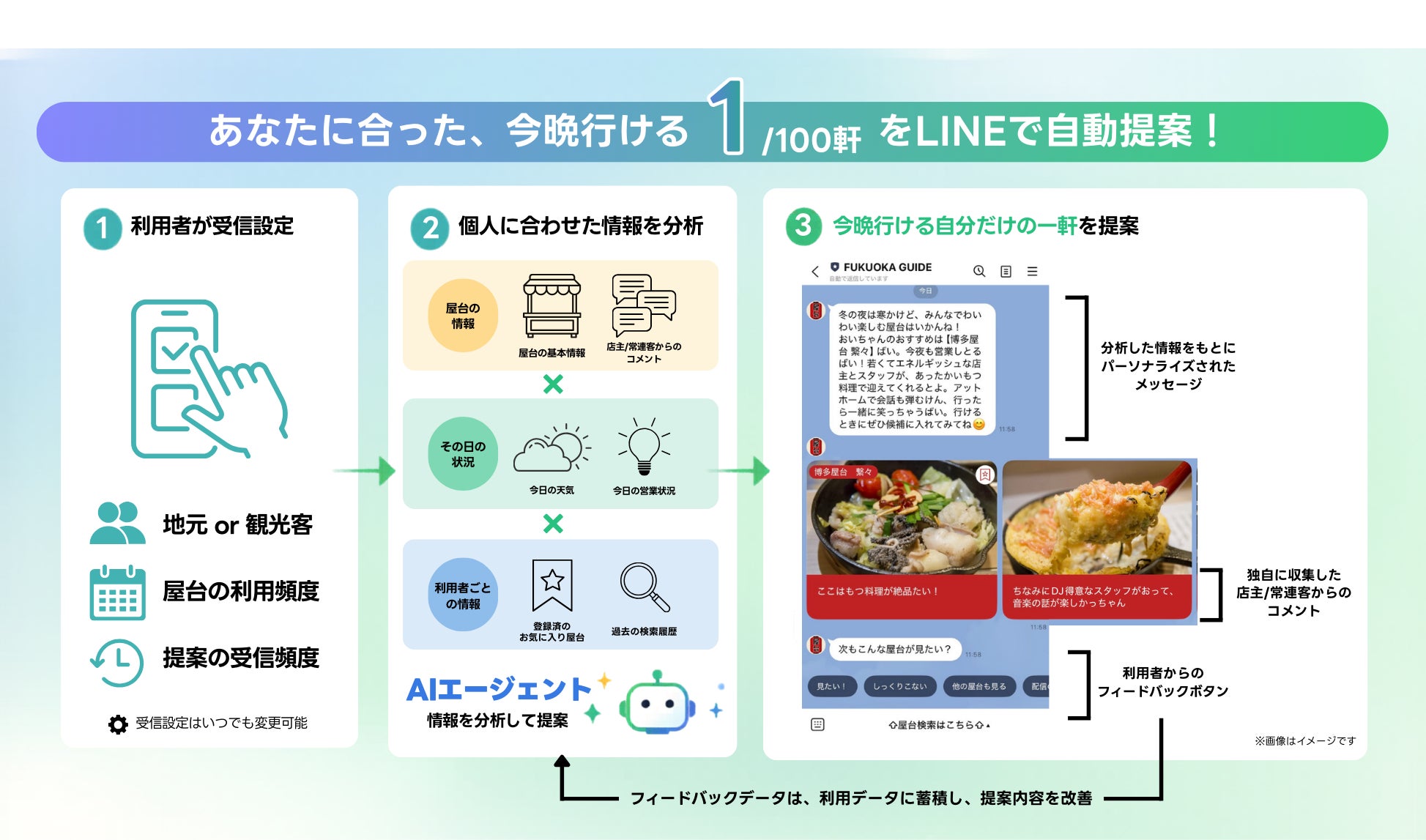 本機能では、当日の天候や屋台の営業状況、利用者の好みをもとに、約100軒の屋台の中から、その人に合った一軒を選びます。利用者が選択した受信条件に応じて、AIエージェントが最適な候補を分析し、営業中のおすすめ屋台をLINEで案内します。