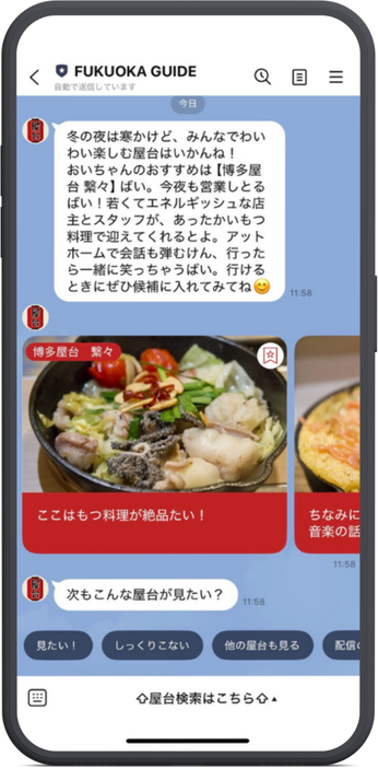 福岡市×LINEヤフーコミュニケーションズ、福岡市初のAIエージェント活用。5万人以上が利用する屋台のLINE公式アカウントに、“今晩行ける自分だけの一軒”を自動提案する機能を追加