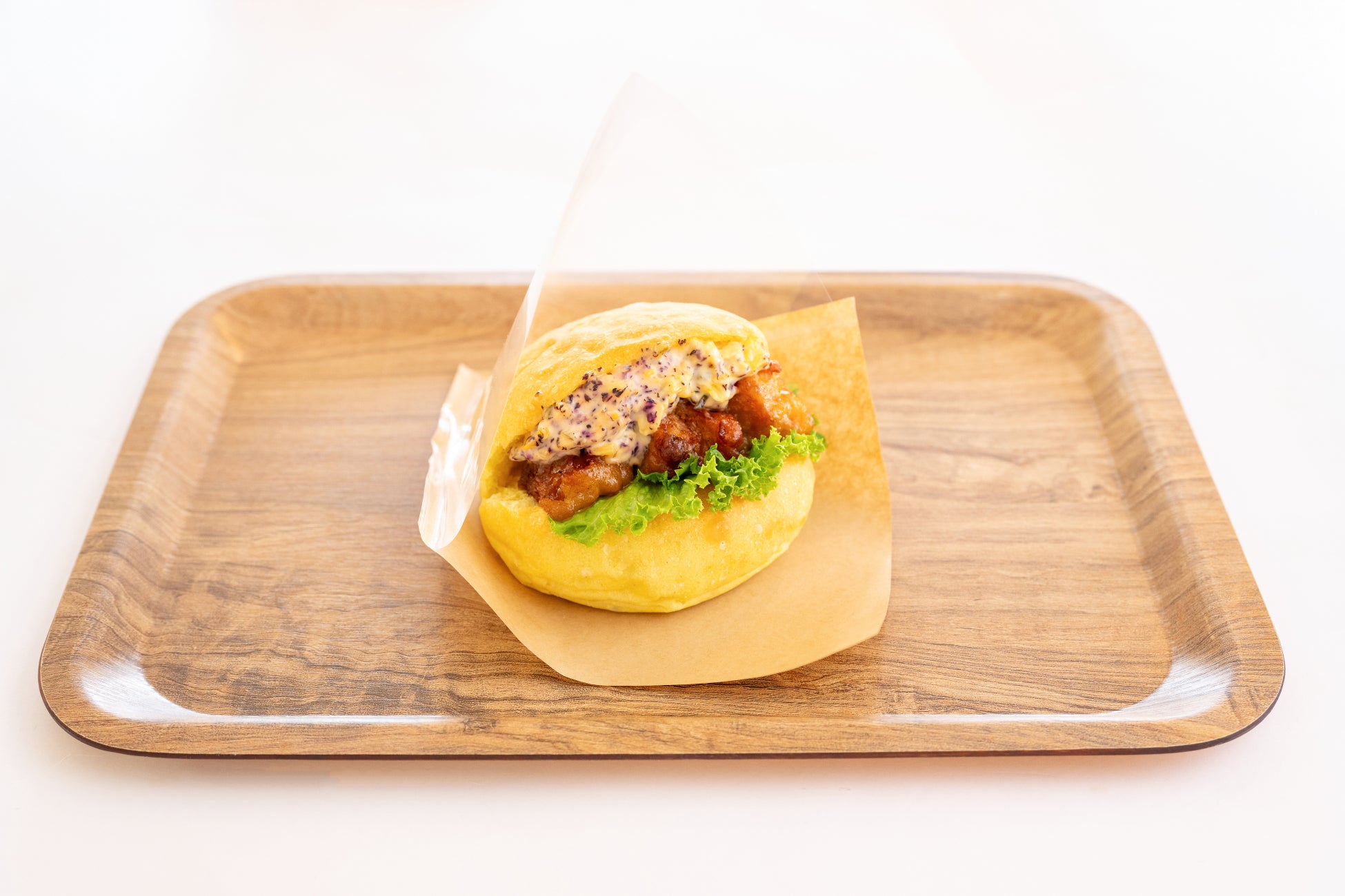 名古屋文理大学の学生が考案した鶏のレモン煮と特製タルタルソースが絶妙にマッチした「稲チキ」をスパイス香るパンに挟んだ新開発のカレーバーガーです。