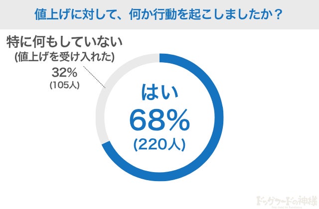 値上げへの対応をしている人は68%。「まとめ買い・セールを狙う」や「大袋購入」が主流。