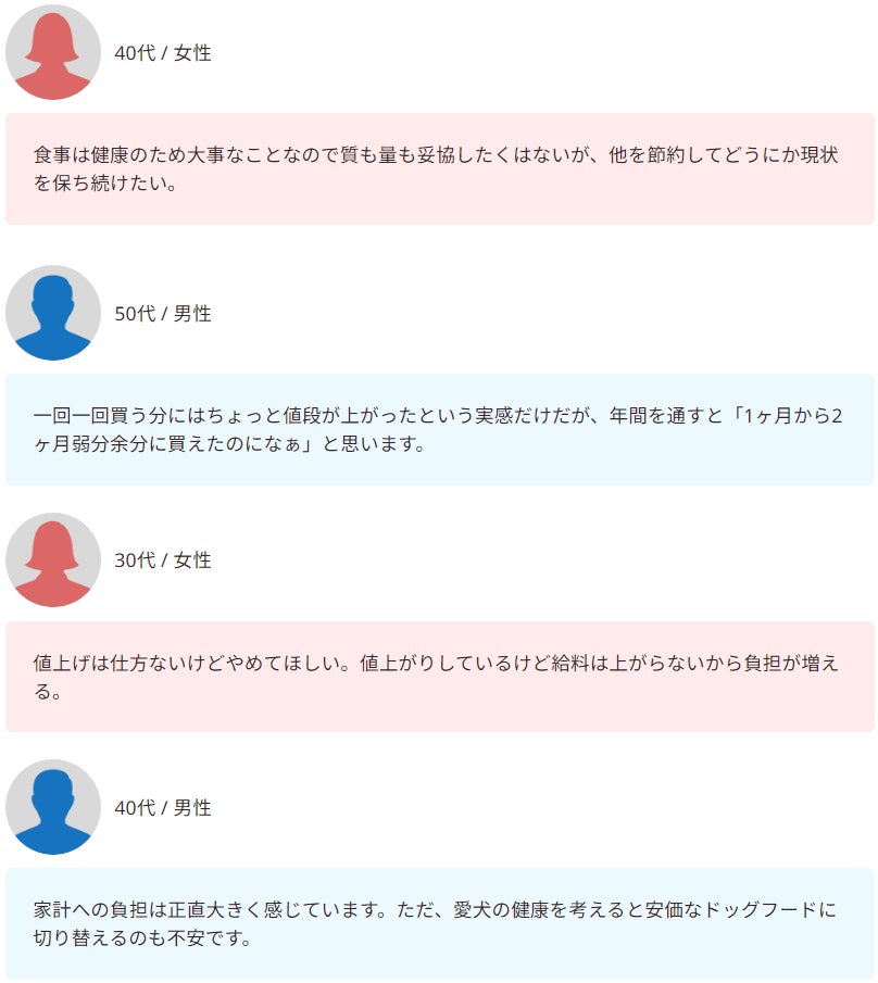ドッグフードの値上げに対しては、先行きへの不安や不満の声も多く寄せられました。