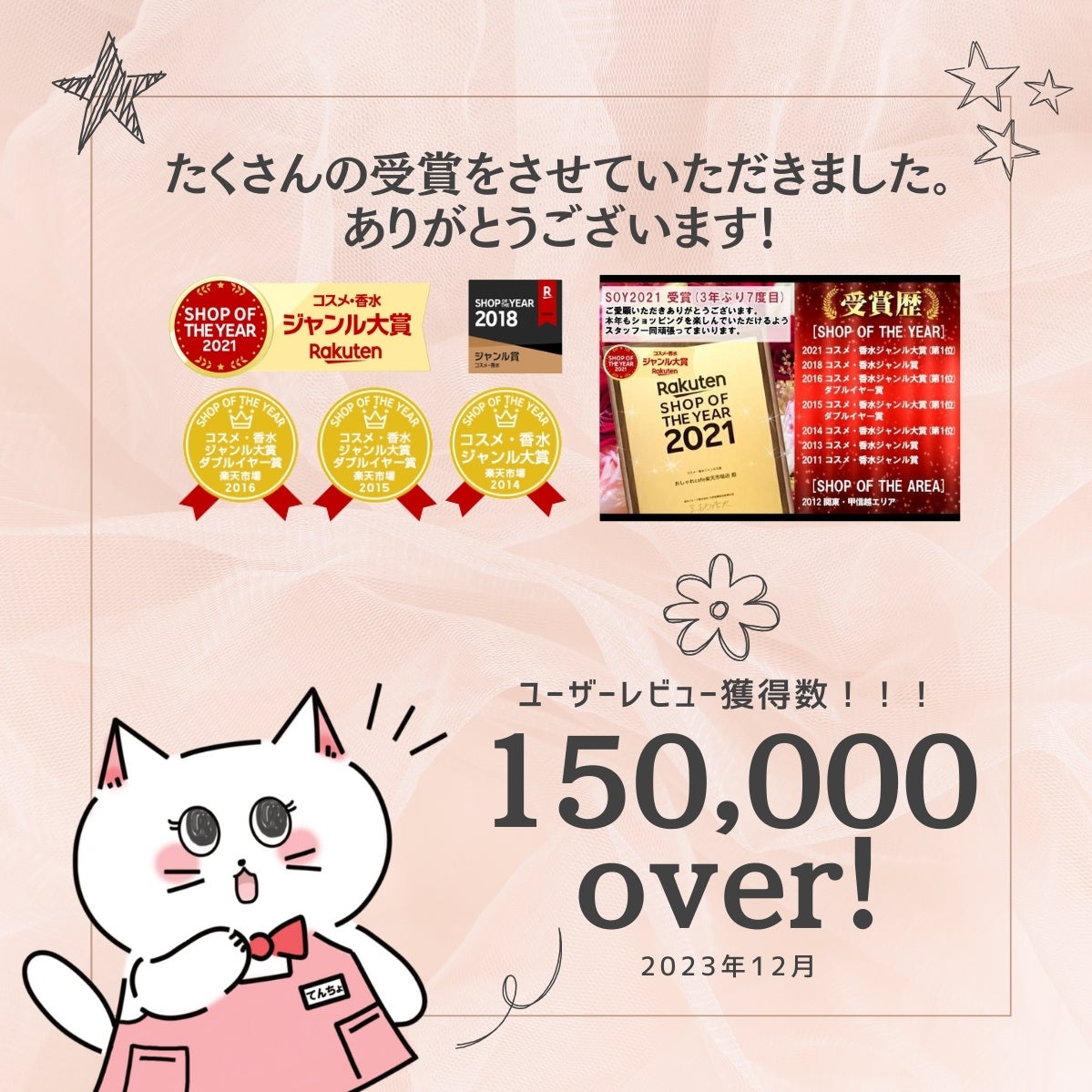 ピュアクリエイトが運営する「おしゃれcafe」は、楽天市場において3年連続*でRakuten SHOP OF THE YEAR(楽天ショップ・オブ・ザ・イヤー)を受賞するなど、お客様から高い評価をいただいており、そのレビュー総数は15万件を超えます。