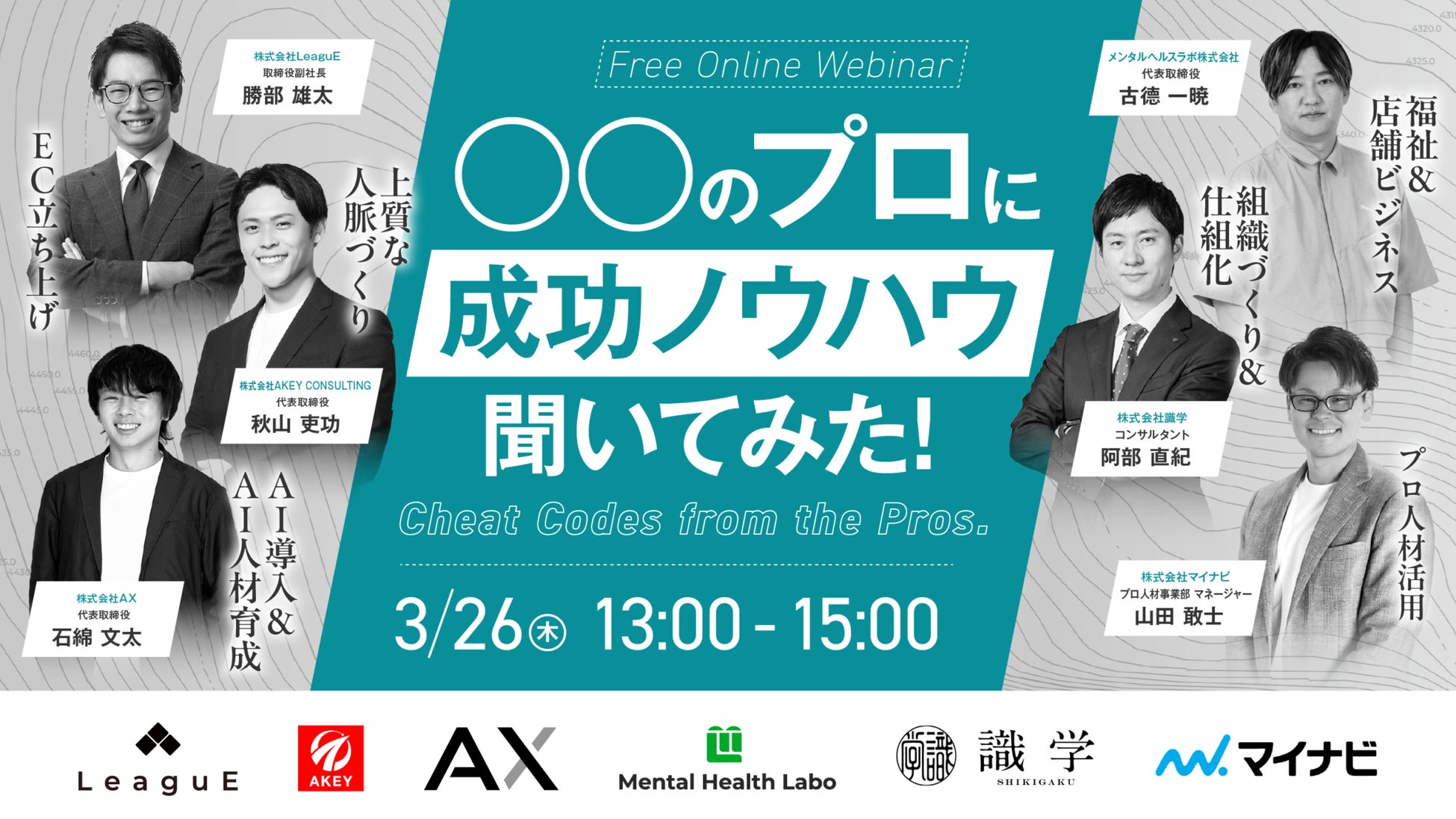 株式会社AX(本社:福岡県福岡市、代表取締役:石綿 文太)の代表・石綿文太が、株式会社LeaguE主催の共催オンラインセミナー 「"〇〇のプロ"に 成功ノウハウ聞いてみた!」(2026年3月26日開催)に登壇いたします。