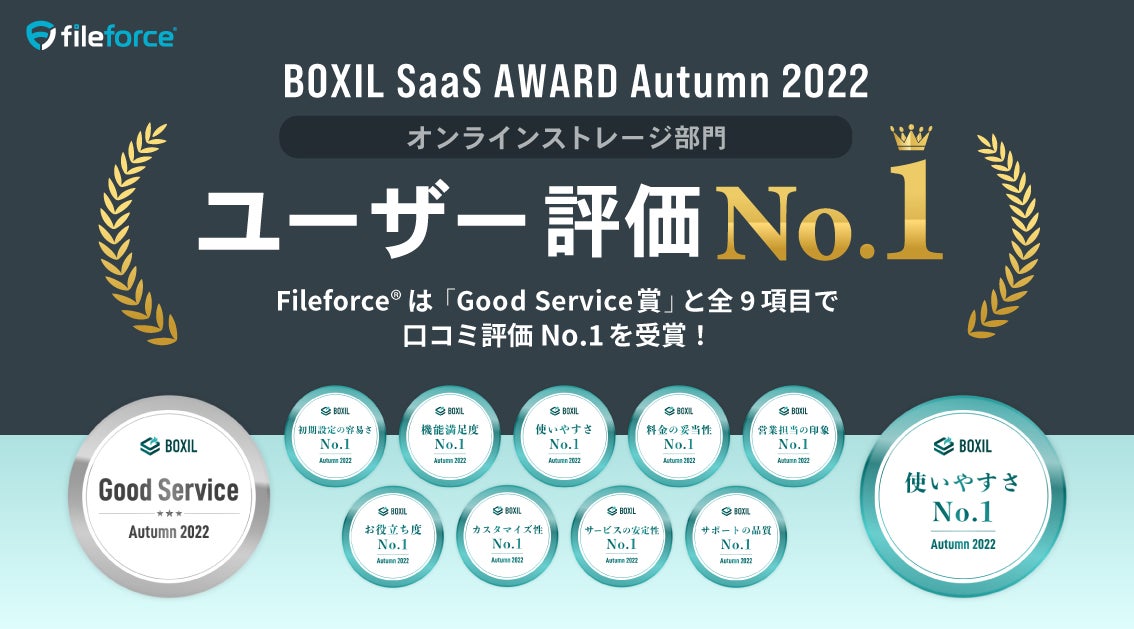 ファイルフォース株式会社、「BOXIL SaaS AWARD Autumn 2022」オンラインストレージ部門における「Good Service」と 口コミ評価の全9項目で「No.1」を受賞