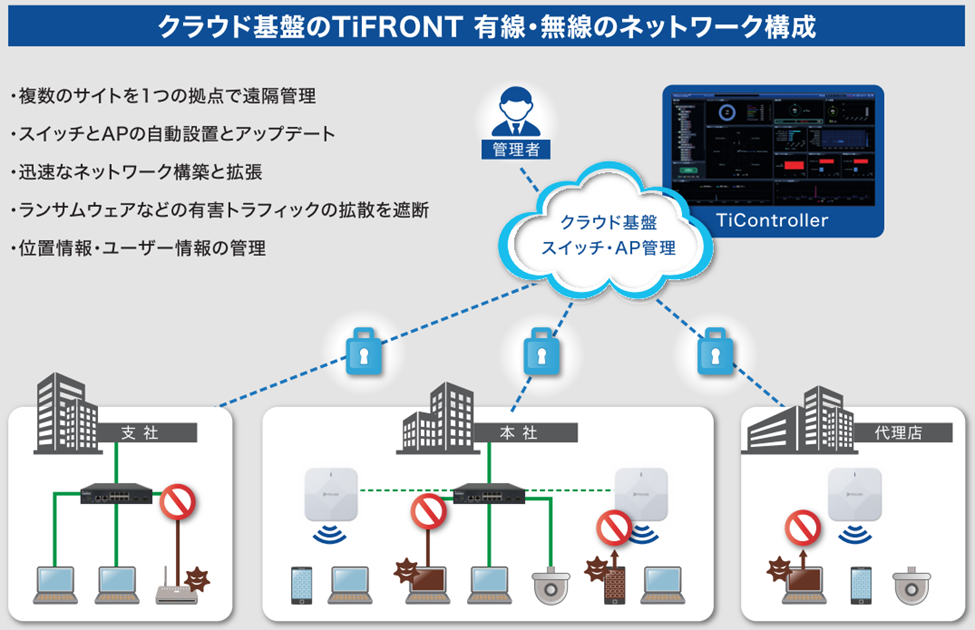 TiFRONT-APは、接続端末の通信を可視化、不正アクセスの検知、攻撃型通信を遮断。AP機器の管理はクラウド上で運用可能なTiController(ティーコントローラー)を利用して、シンプルな管理でネットワークの安全を確保するセキュリティAPです。