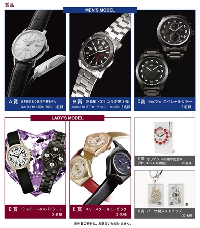 本キャンペーンでは、世界限定1500本、シリアルナンバー「1500」の『オリエント ワールドステージコレクション 60周年記念世界限定モデル』や、世界限定1000本のうち、シリアルナンバー「137」(今年、ドイツで開催された「第37回ニュルブルクリンク24時間レース※」にエントリーした「SUBARUインプレッサSTI」のカーナンバー)と「1000」の『オリエント ワールドステージコレクション STIコラボレーション セカンドモデル』などのレアアイテムをプレゼント賞品にご用意いたしました。また、“ハート”がモチーフの人気アイテム『iO スイート&スパイシーⅡ』や、“レトロ”と“ポップ”の両方のテイストを併せ持った『オリエント スリースター キュービック』などのレディースアイテムを取り揃えたほか、当社の歴史やこれまでに発売したアイテムなどを紹介した書籍『オリエント☆(ホシ)物語 ~機械式時計おもしろ計画進行中~』や、当社の時計ムーブメントパーツを封入した『特製ストラップ』など、合計60名様に賞品をプレゼントいたします。