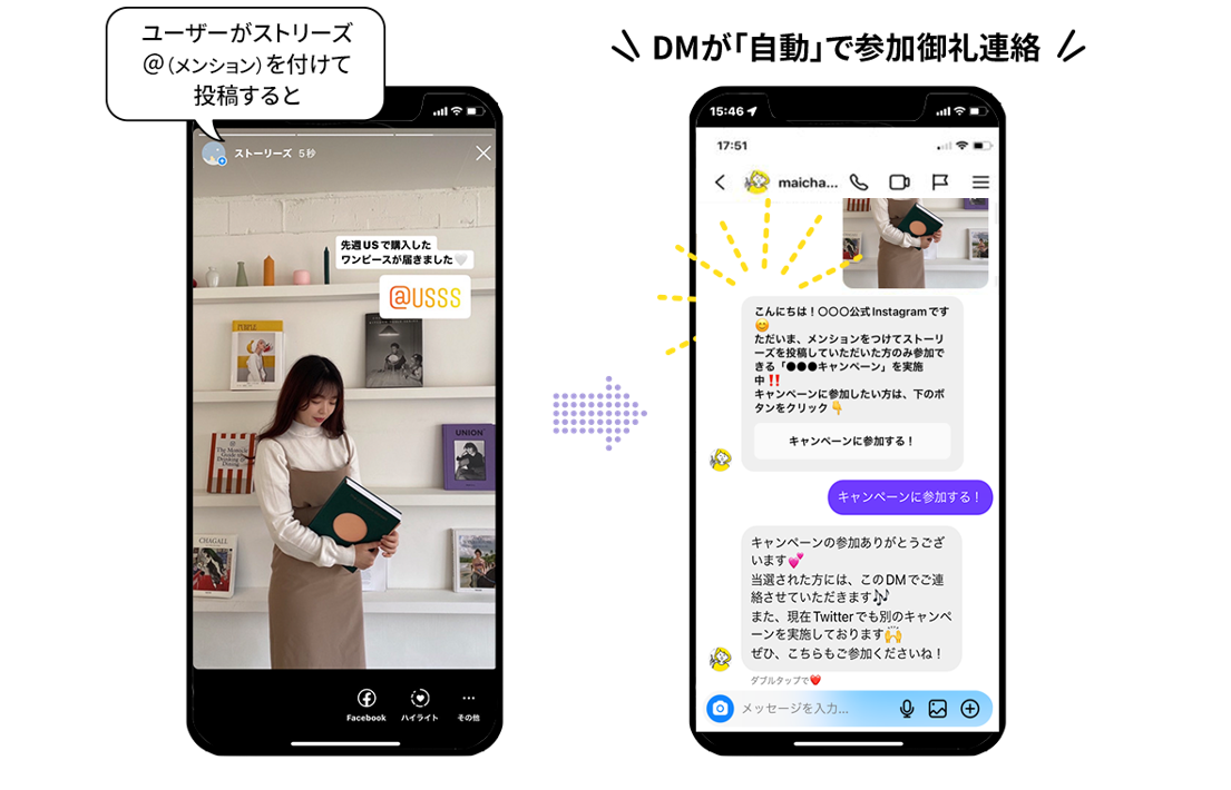 「チャムスタ」を使ったシステムでは、ストーリーズメンション(アカウントのタグ付け)がキャンペーンの参加条件となるため、参加者が発信する情報は企業アカウントの情報として活用でき、キャンペーンを通してUGCを増やしやすい仕組みとなっています。