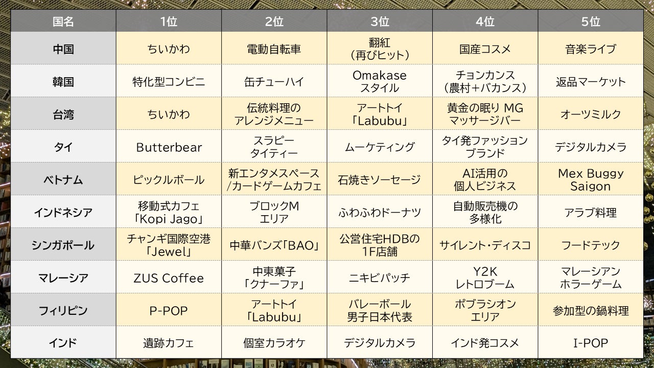 2024年に各国で「なにがヒットしトレンドになったのか?」、現地ボードメンバーに対するヒアリングや実態調査を行い、TNCアジアトレンドラボで分析をして、上位5位のランキング形式にまとめた
