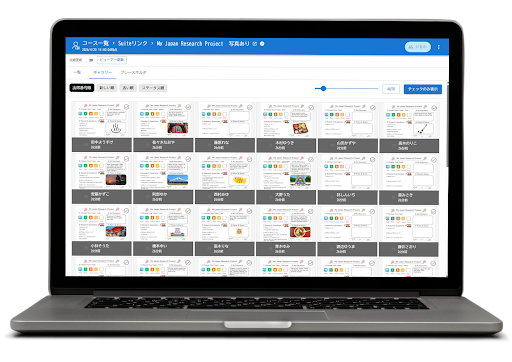 Google Classroom で配信した課題は、自動的に出席番号順に整列して表示されます。また、ギャラリー表示でクラス全体の取り組み状況を一目で把握・比較することができます。