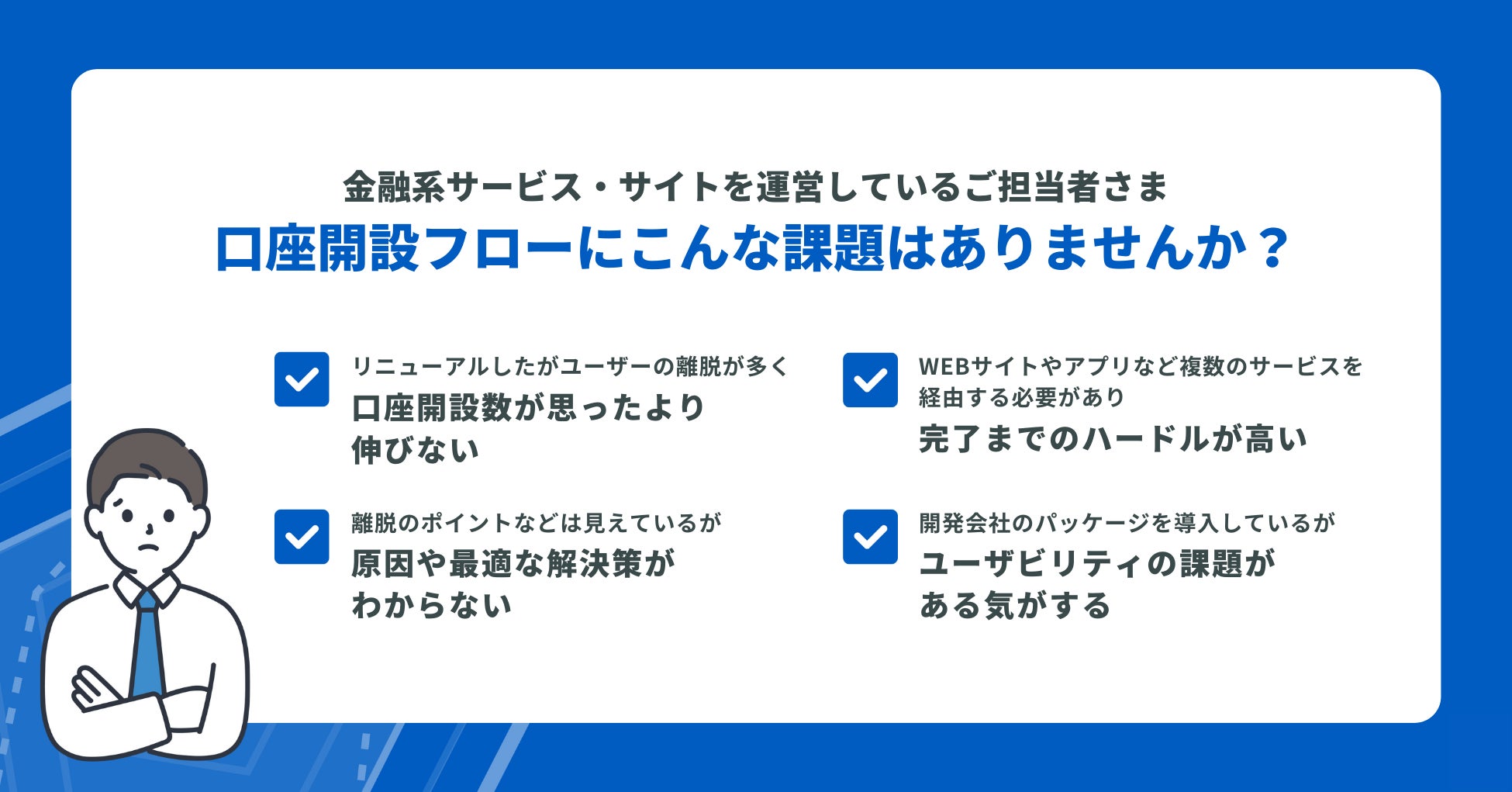 口座開設を行うフローの中でユーザーが離脱するポイントは把握できているものの、具体的な原因や最適な解決策を見出せていない