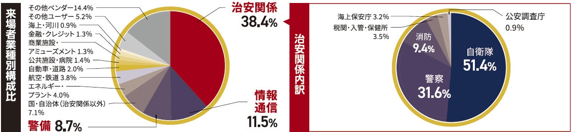 本展では入場審査を行い、来場者を『テロ対策』関係者のみに限定。治安関係者(警察・消防・自衛隊・海保・税関等)の来場者比率は実に40%を誇ります。来場者限定のクローズドショー形式の展示会だからこそ実現する高精度なマッチングと圧倒的な出展者満足度が、本展の最大の特徴となります。