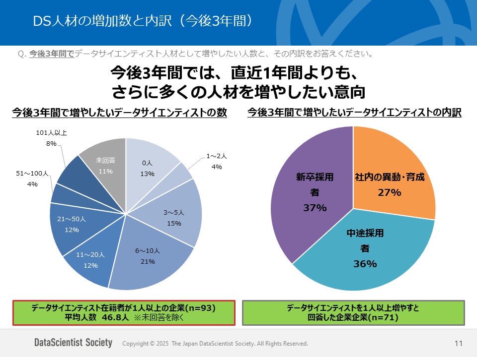「2021年以来、3年ぶりに企業のデータサイエンティスト採用に関する調査を実施しました。今回の調査は、データサイエンティスト協会シンポジウムに参加した企業担当者に対して聴取しました。3年前と比べると生成AIの急速な普及のインパクトが大きく、今後増やしたいDS人材像として、統計やAIに詳しい人材(63%)やビジネス課題解決人材(61%)が高いなど、AIのビジネス活用が強く期待されていることが分かりました。また、シンポジウム参加企業においては社内研修制度を整えている企業が76%、データサイエンスに関する専門部署がある企業が81%と、データサイエンティストを育成する環境整備も進んできていると言えそうです。」
