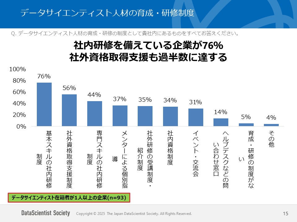 ・DSの育成・研修の制度として、社内研修制度を整えている企業が76%と多く、社外資格取得支援制度を整える企業も56%と多い