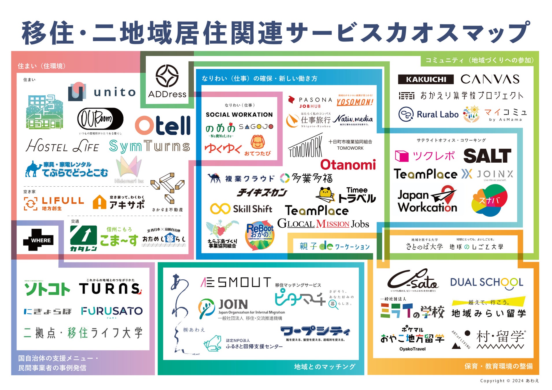 ベンチャー企業誘致や起業家育成等を核とした地域振興に取り組む株式会社あわえ(本社:徳島県海部郡美波町、代表取締役:吉田基晴、以下あわえ)は地域の継続的な発展にはもっと地方に関わる人々の力が必要と考え、移住・二地域居住関連サービスが社会認知され一般的にするべく、「移住・二地域居住サービスカオスマップ」を作成し公開しますことをお知らせいたします。
